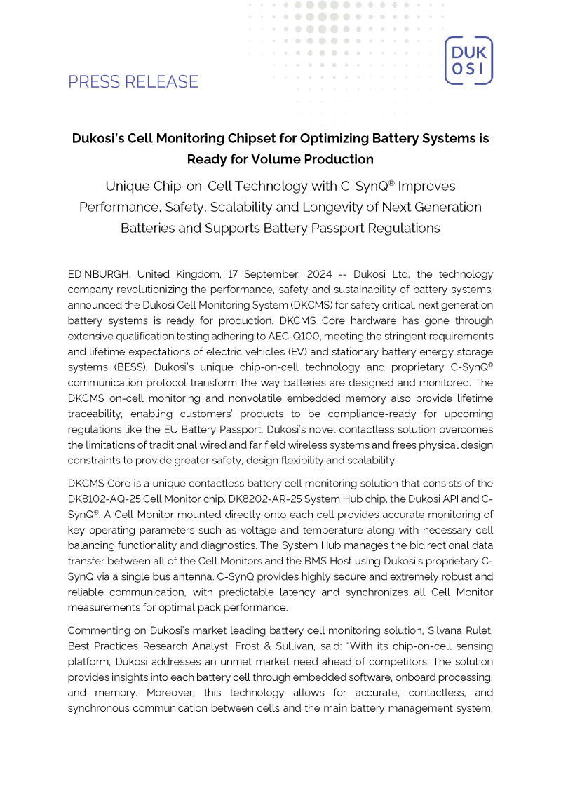 Press Release: Dukosi’s Cell Monitoring Chipset for Optimizing Battery Systems is Ready for Volume Production