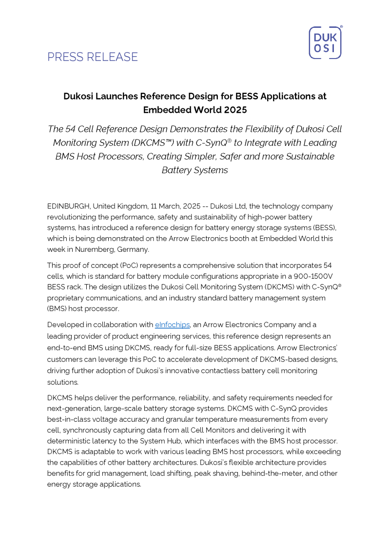 Press Release: Dukosi Launches Reference Design for BESS Applications at Embedded World 2025