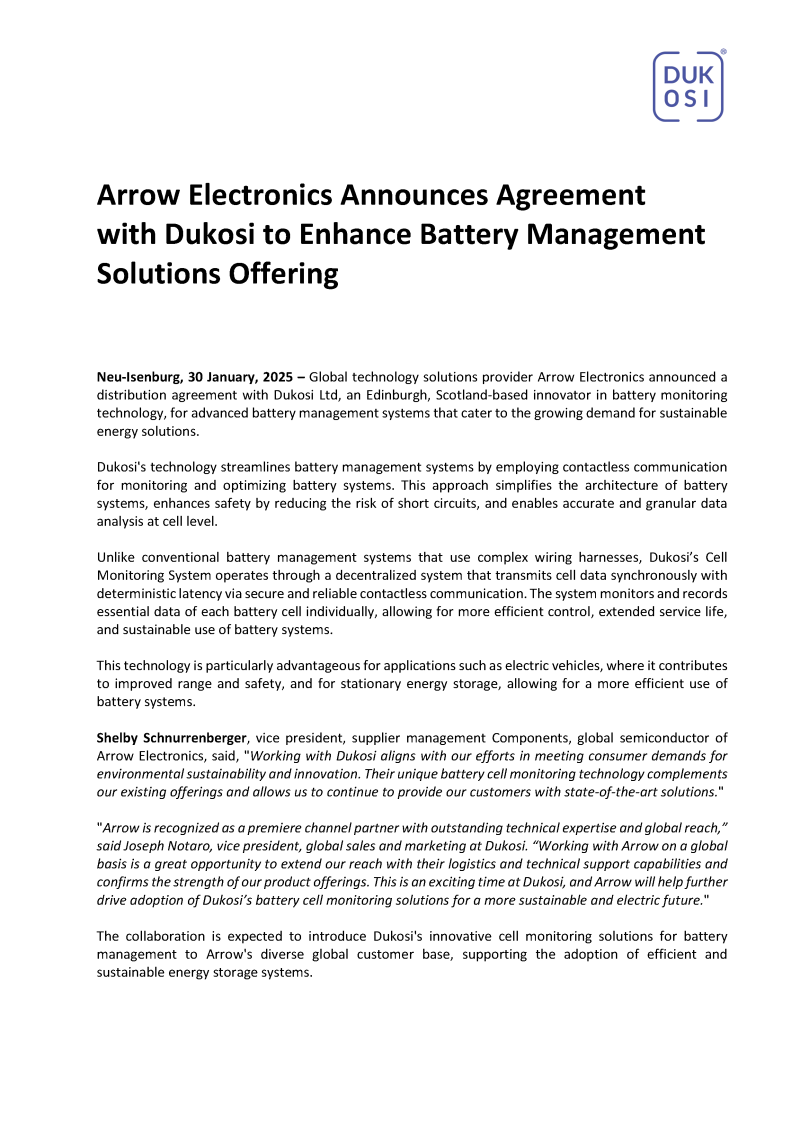 Press Release: Arrow Electronics Announces Agreement with Dukosi to Enhance Battery Management Solutions Offering