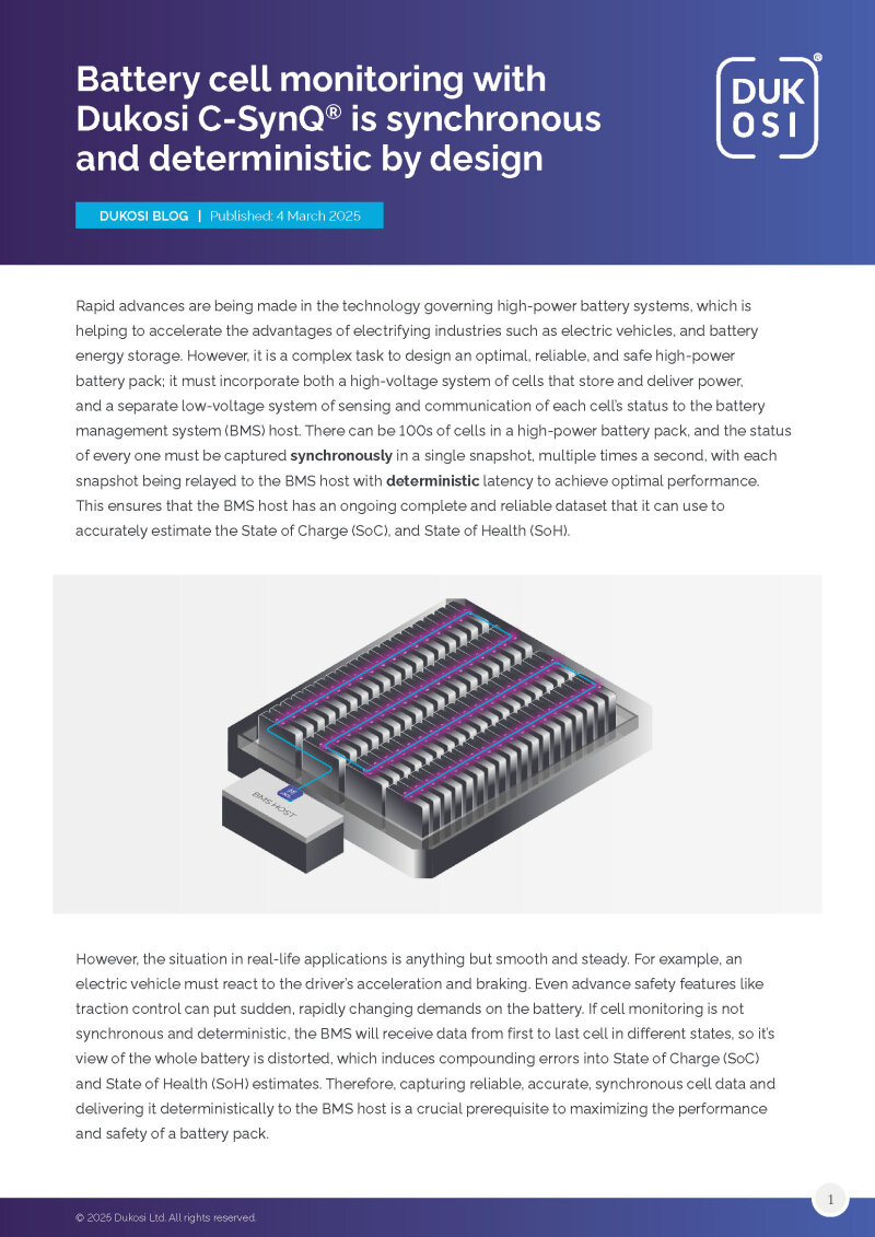 Blog: Battery Cell Monitoring with Dukosi C-SynQ: Synchronous and Deterministic by Design