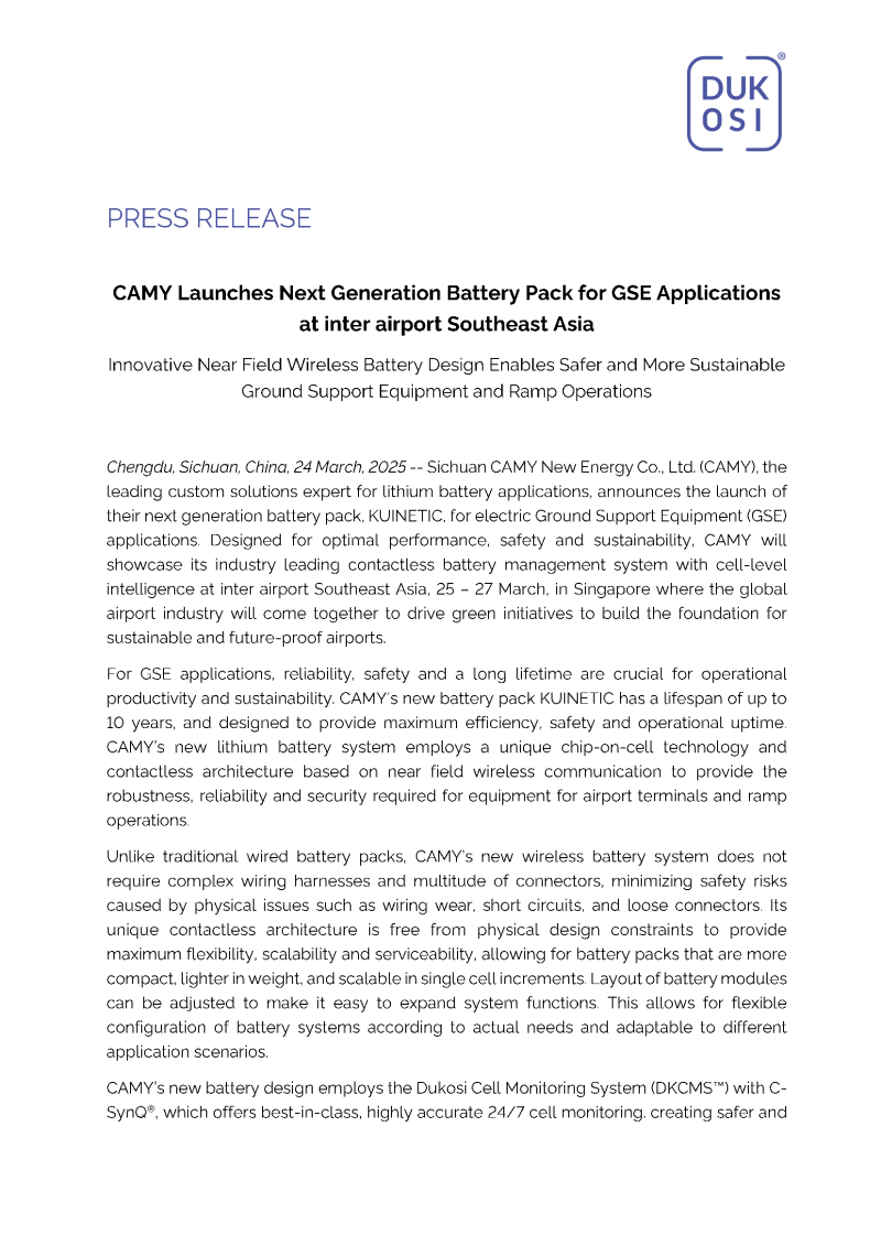 Press Release: CAMY Launches Next Generation Battery Pack for GSE Applications at inter airport Southeast Asia